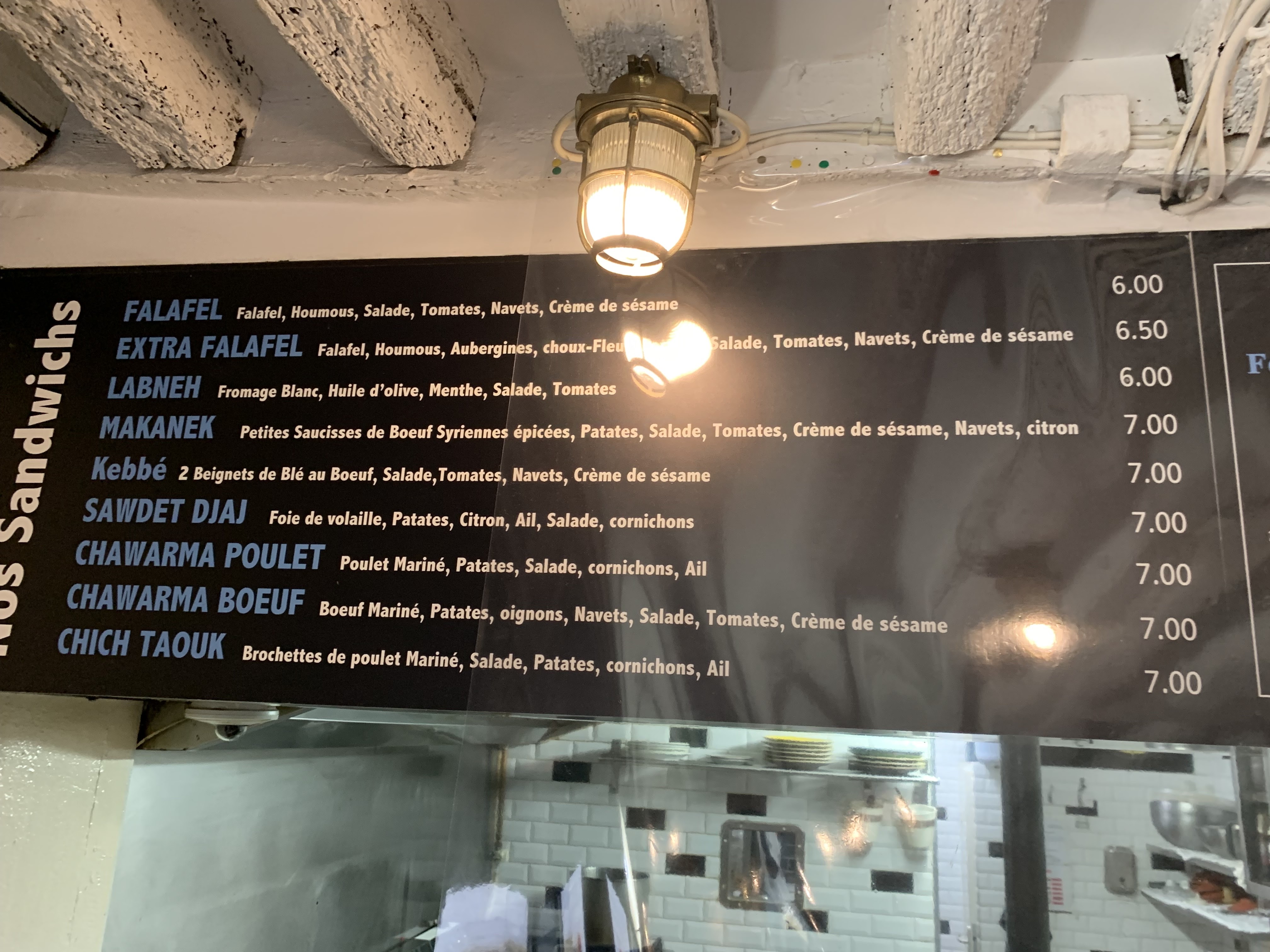 Sandwichs falafels très bon mais parfois je trouve quelques ingrédients pas frais comme les pommes de terre ou les aubergines..c'est dommage..les kebbe sont très bons.. généralement tout est bon mais il faut faire attention à la fraîcheur de certains produits.