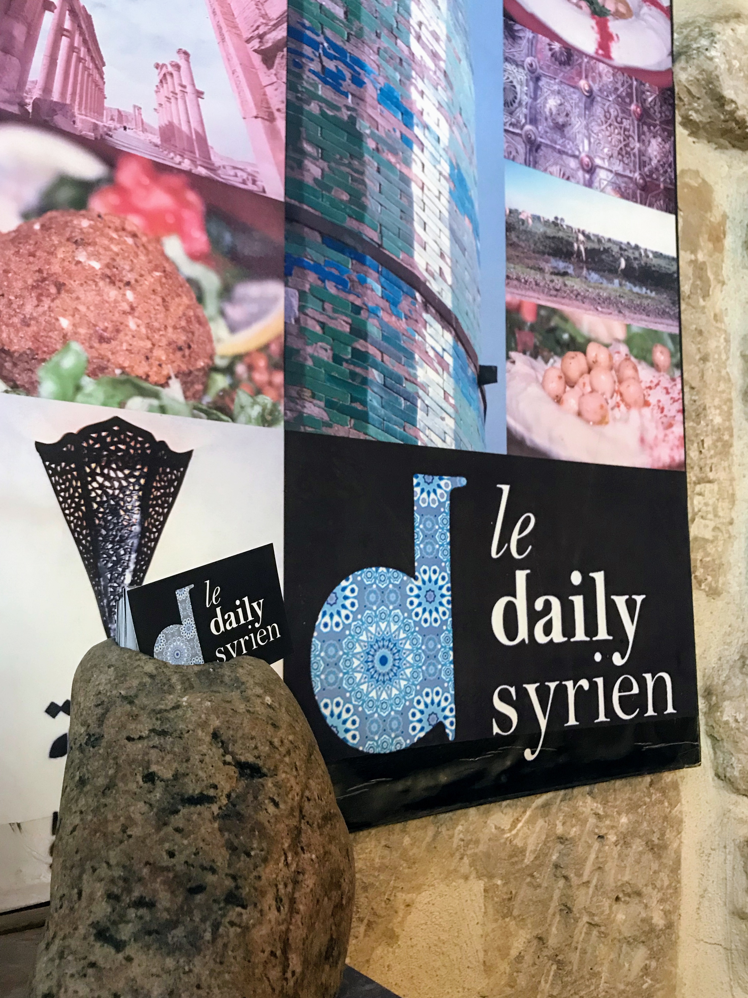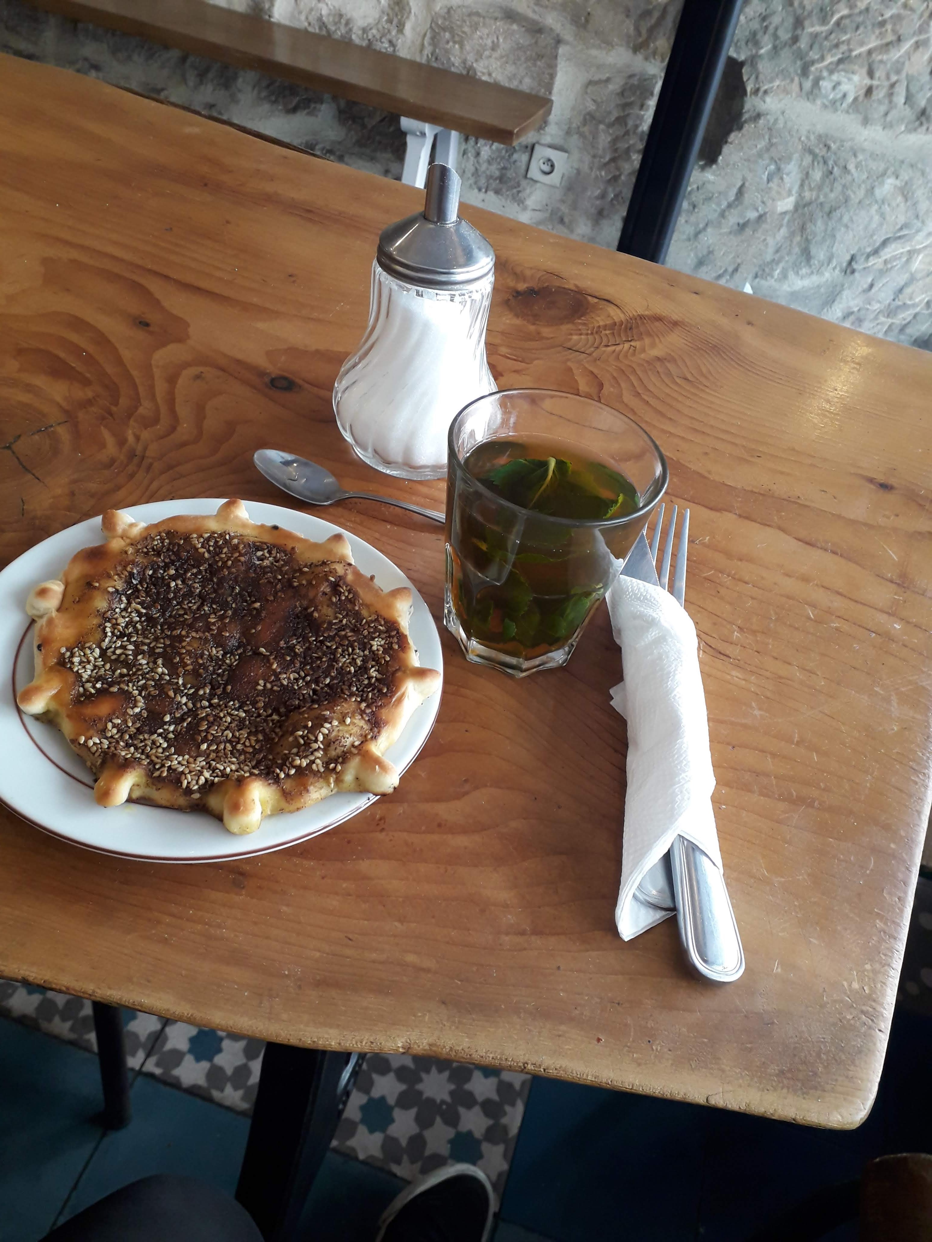 Ce point presse, restaurant syrien, nous a interpellé quand nous sommes passées devant, après avoir jeté un oeil par sécurité sur les commentaires, nous avons décidé d'y dîner. L'endroit est beau, en pierres apparentes, avec des journaux en vente et une table d'hôte en bois. Dans l'assiette c'est très beau aussi, et excellent. J'ai pris un sandwich fallafel, un des meilleurs que j'ai mangé, les saveurs de chaques ingrédients sont bien présentes et chaque bouchée a un goût différent. Comme une phrase le rappelle sur une ardoise, ici on nourrit le corps et l'esprit.