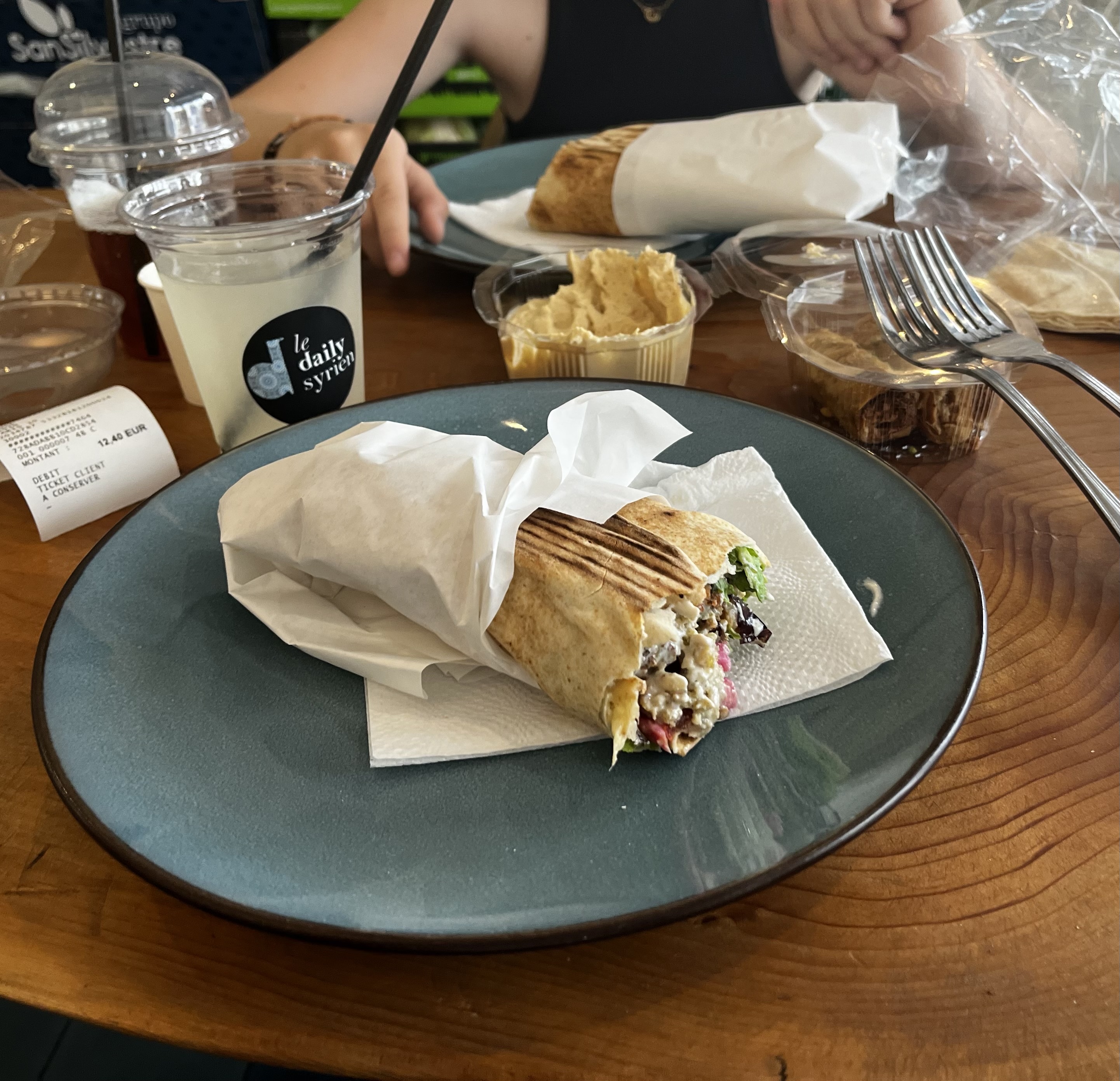 Un délice de saveur de goût de texture de couleur, de menthe : le houmous à un goût extra. cuisine middle-east Syrienne, cuisine cousine du Liban, mais avec ses spécificités. Et je n'ai goûté que le falafel pour l'instant! ( depuis j'ai pris un Shawarma ... emballé à l'ancienne, pro, dans du papier alimentaire blanc avec un chapeau blanc que tu enlèves et tu peux manger ton chawarma sans en mettre partout ). Prix en conséquence, des sandwichs et cie, pdts frais, qualité, faits maisons, il y a les boutiques, le restaurant rue des petites écuries, ils sont traiteurs. Bette table en bois + bancs et chaises à l'entrée : le lieu petit, c'est plus de l'emporte, pour manger. On peut s'asseoir ou boire un thé à la menthe, manger sur place, sur le pouce, un moment : ça va dépendre de l'heure, pour la place assise. Par exemple : je suis restée 1h30, après mon sandwich, j'ai siroté le thé à la menthe ( 2,50€ ) très chaud, j'ai regardé les passants qui passent, à l'orientale, en buvant le thé. + des prises pour recharger le portable : pratique. Il etait 15h30, heure creuse. Meubles anciens vintage, restaurés. Image soignée, pour la décoration et le logo Daily Syrien, street food middle east du quartier, mais accueillant, et pro à l'ancienne. 😀 Qd je passe de dans ce coin-là de Paris 10. Il y a un deuxième Daily Syrien dans la rue, décors de boucherie (une vraie boucherie qui était là avant j'imagine) qui propose des plats différents et pareils + de la citronnade ...miamhum... Même maison, même esprit, même accueil souriant, pro. Ce coin de Paris se gentrifie toujours + et le quartier continue ( depuis 30 ans) sa transformation, des vieux commerces, rideaux de fer fermés, tagués, qui seront rachetés, retapés, gentrifiés. Avec le beau décors, des prix + chers, Il y a une nouvelle clientèle, urbaine, jeune, réseaux sociaux,vélo, aimant la food, qui se déplace et compare ... Mais : SI il y a une âme, un accueil, la qualité, un sourire, de la simplicité, alors ok. Ce quartier ce coin du 10e, est tjs - dans ses rues - populaire, bruyant, métissé, communautaire, dur, cosmopolite, très vivant. Mais ça change à grand pas depuis 30 ans ( voir la rue René Boulanger, château d'eau, lancry ... ) Avec ces décos de commerce et ces concepts de boutiques, resto, on se croit un peu comme dans un Paris revu par Hollywood. En même temps c'est bien pour le 10ème arrondissement, l'Est Parisien, si tt les riverains dans le quartier peuvent profiter de tous ces changements vers le haut du quartier. ( on le voit le changement surtout par les enseignes et les commerces, les réhabilitations... ). Tant mieux si ca ne chasse pas non plus les plus pauvres, avec des loyers trop chers et les communautés immigrées populaires ( et entrepreneuse ) : canal historique de ces coin du 10e.